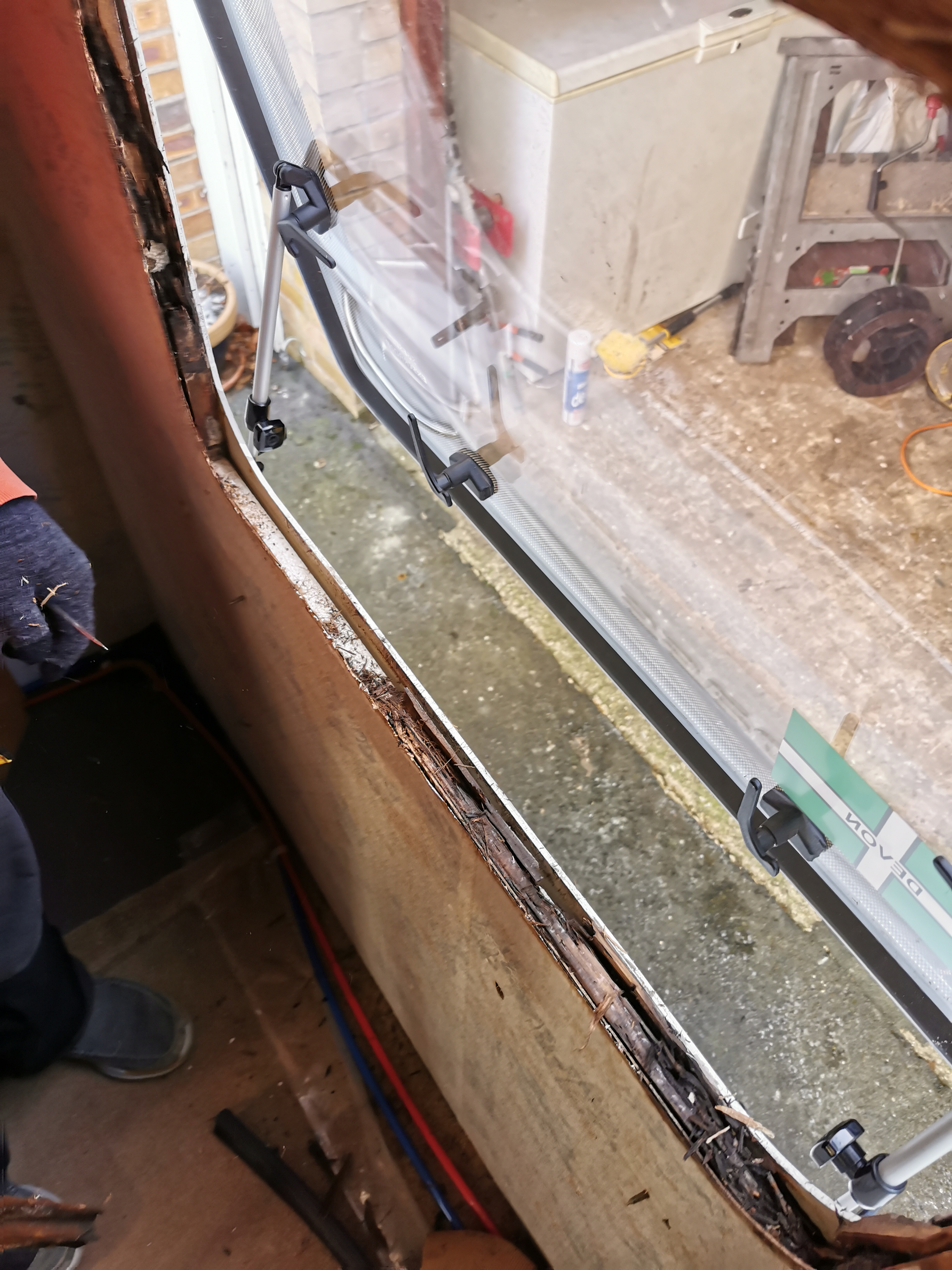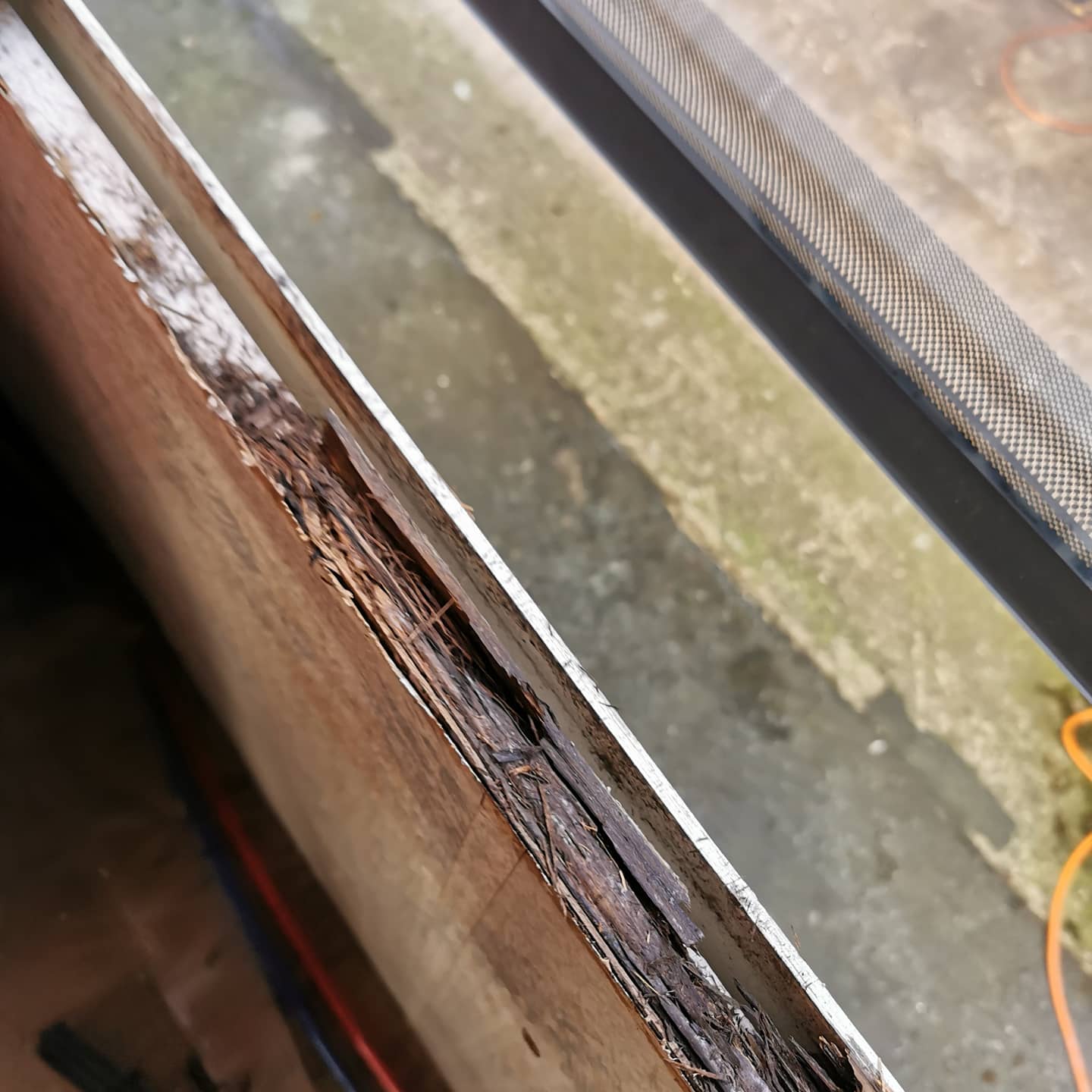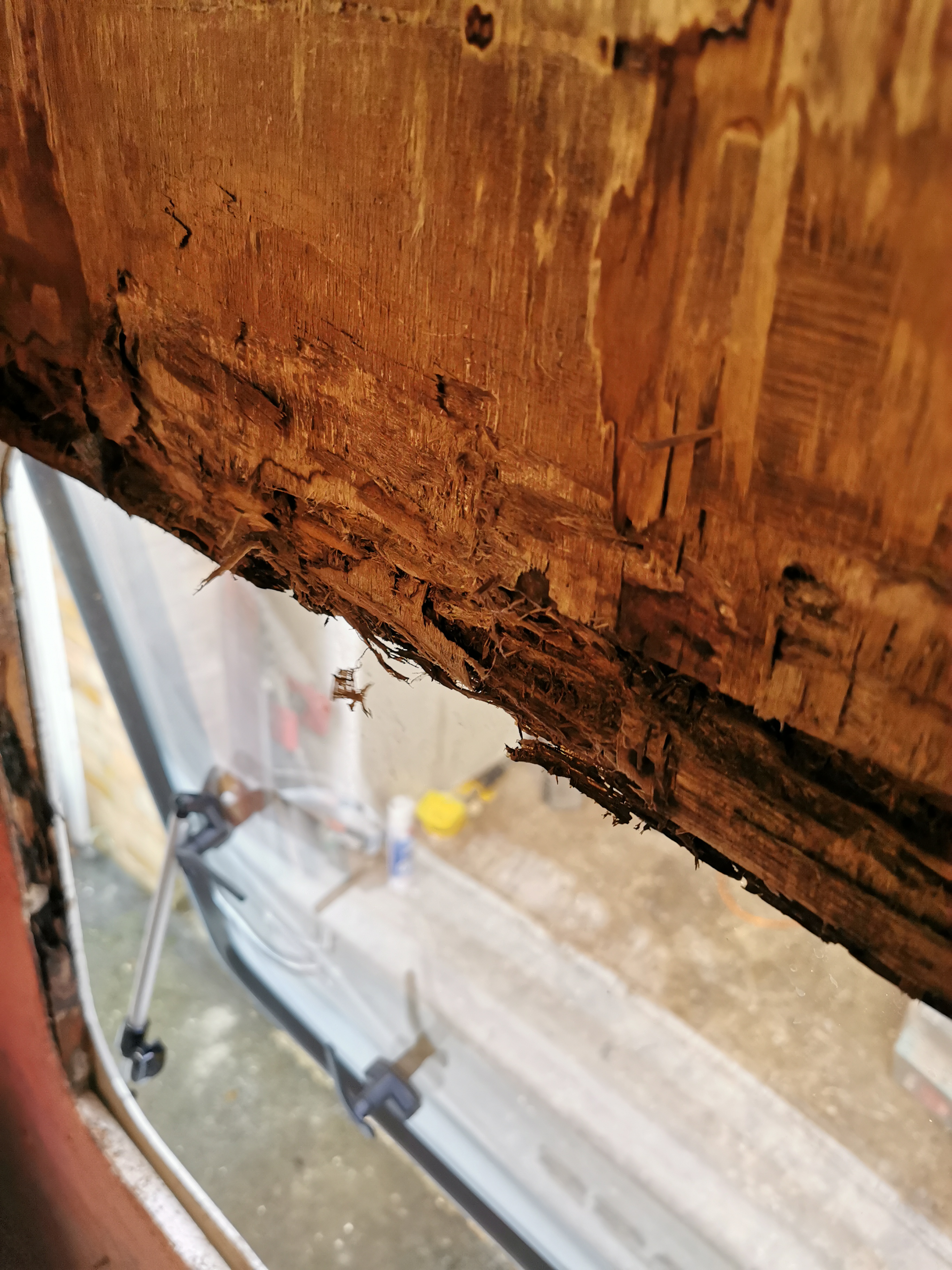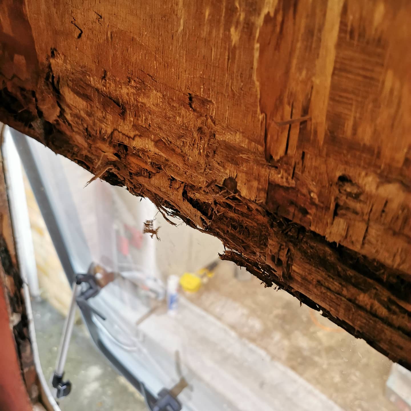 The water ingress had caused large scale rott in the window frame and the surrounding wood. This ment that all of the wall needed to be removed. A large structural cross member had started to decay, so any wood that couldn’t be remove was treated with Ronseal Wood Harder.