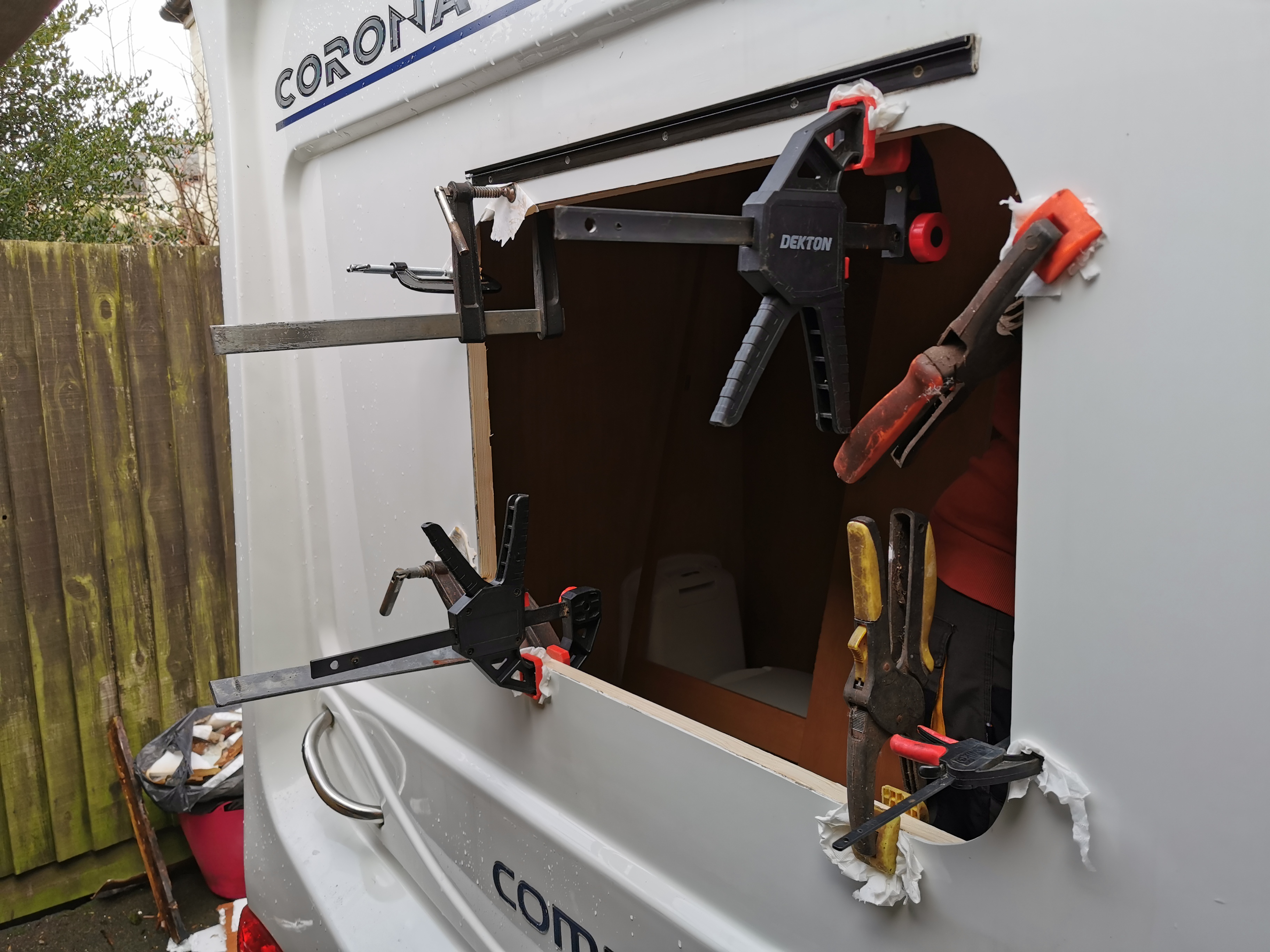 The caravan’s best friend SikaFlex EBT+ White General-purpose Adhesive, sealant & filler we used this to glue the window frame to the rear panel, to re-seal the window bracket and to re-seal the awning rail.