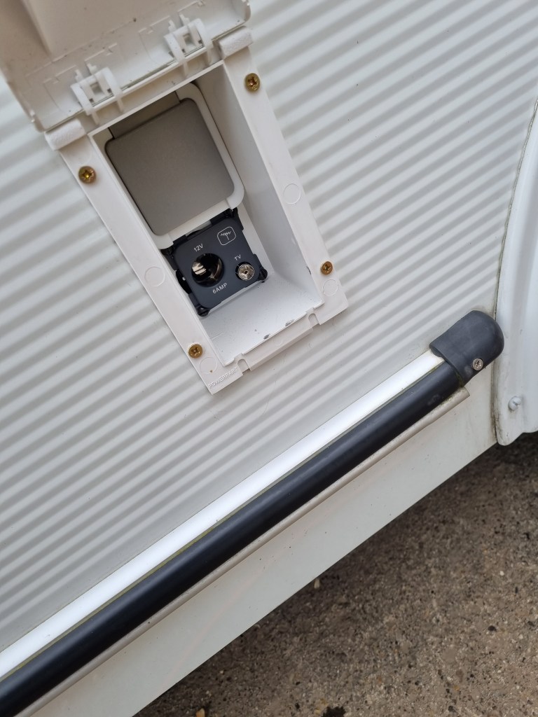 For Christmas we were brought the Dometic Gale Electric Pump for our Kampa Air Awning. This is a 12 volt appliance to save having to pull the car up close to usethe pump weha installed a external 12volt point. This also has a coax TV point that we have connected to the van to allow us to connect to external ariels provided at a number of sites.