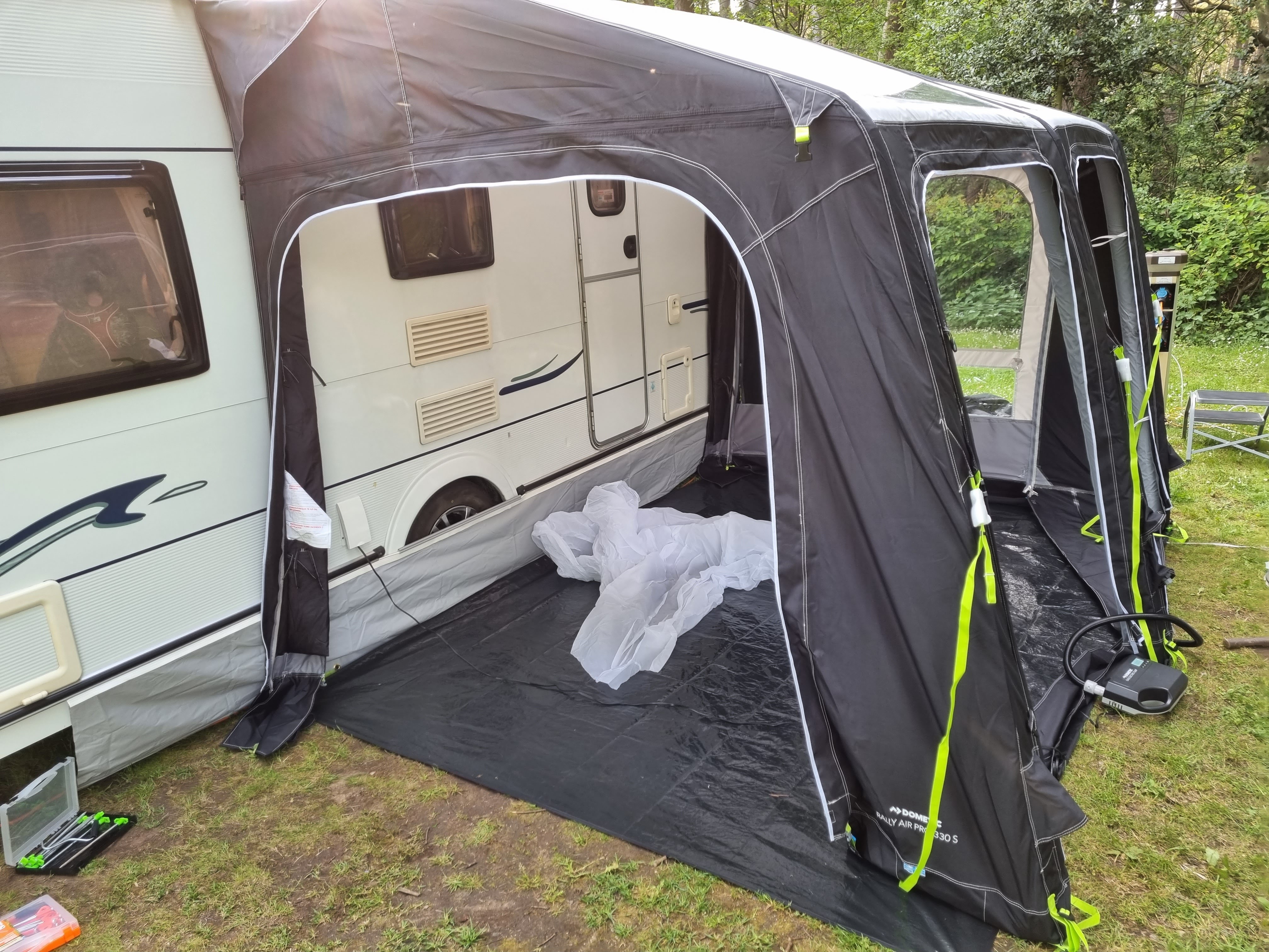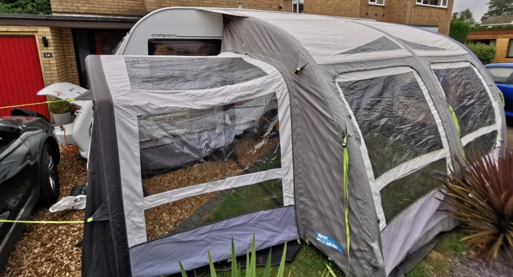 During a trip to Derbyshire and following a very opatune conservation in a camping store we purchased a second hand Kampa Air Awning with bedroom and conservatory annexes.