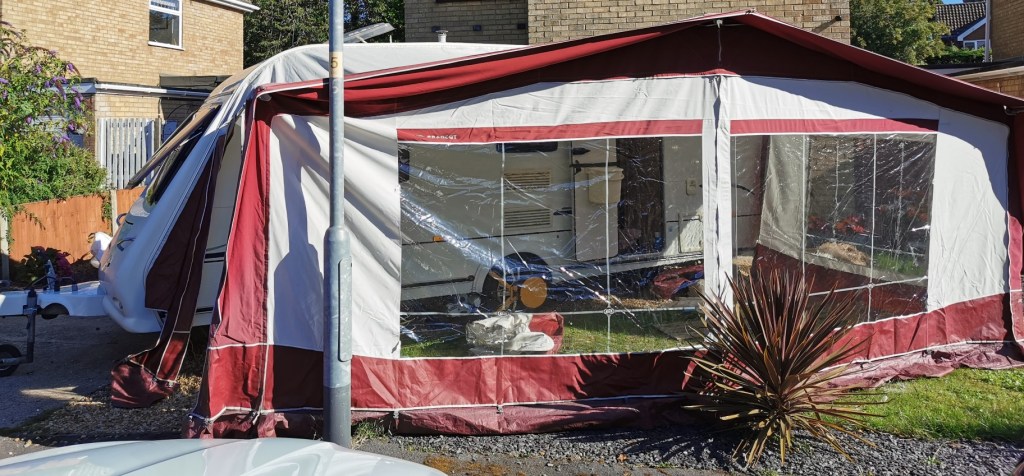 While still waiting for the towbar to be fitted to our car we decided to have a go and putting the awning up on our front lawn.