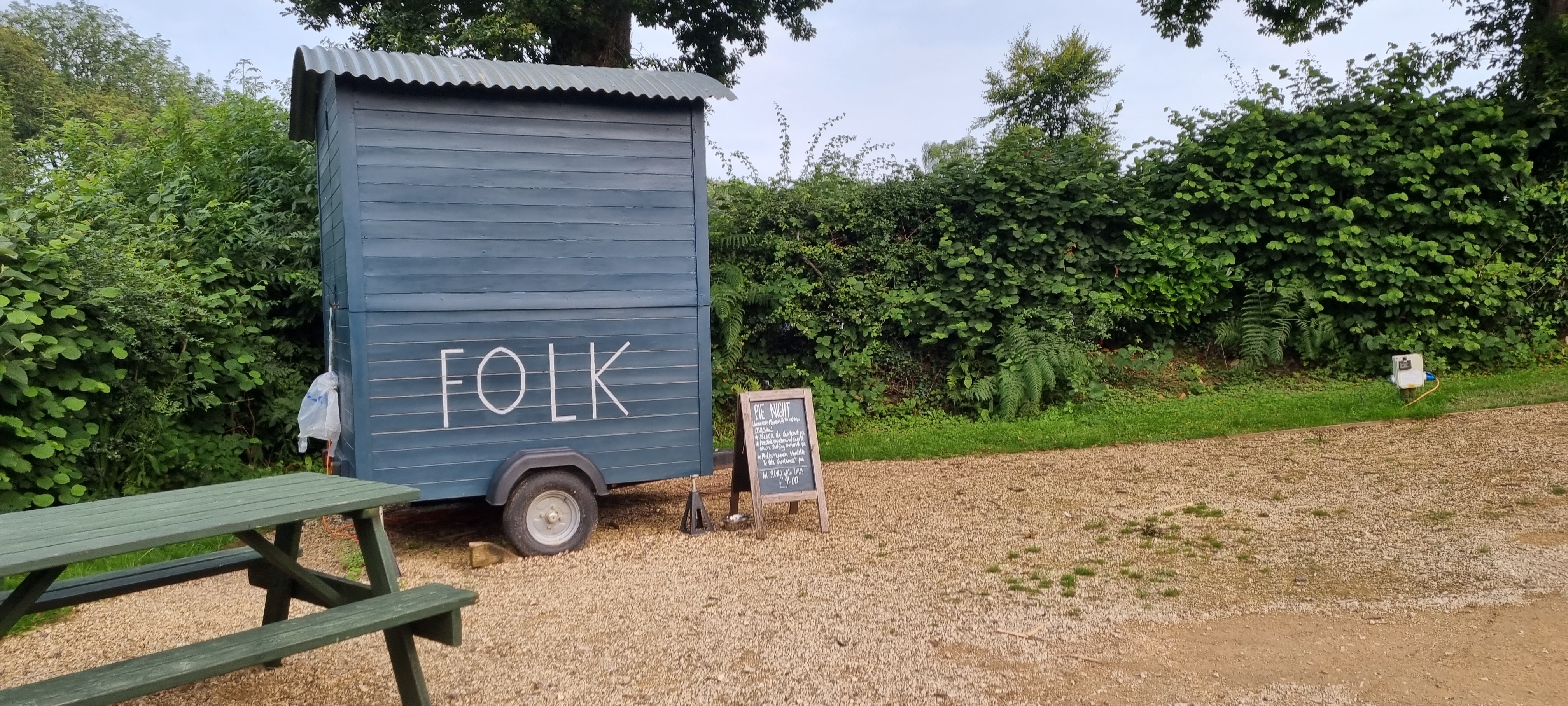 There are a number of food vans that visit the site each week, including fish and chips, pizza and Folk – breakfasts, pies etc.