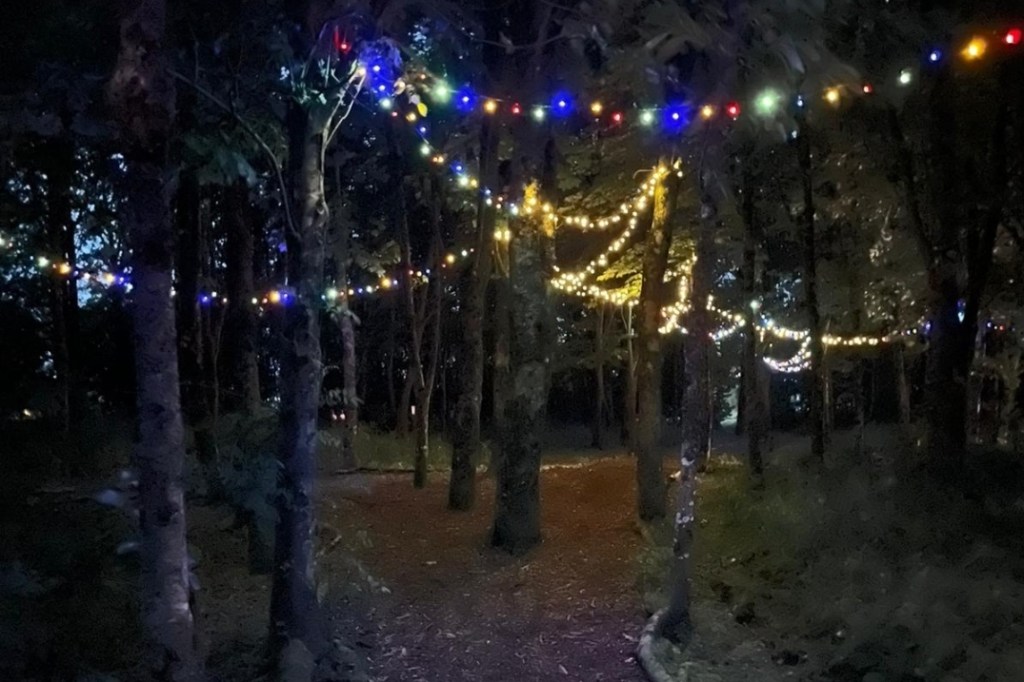 - Dogs welcome, Dog washing area. Large Dog walking area lit with fairy lights at night.